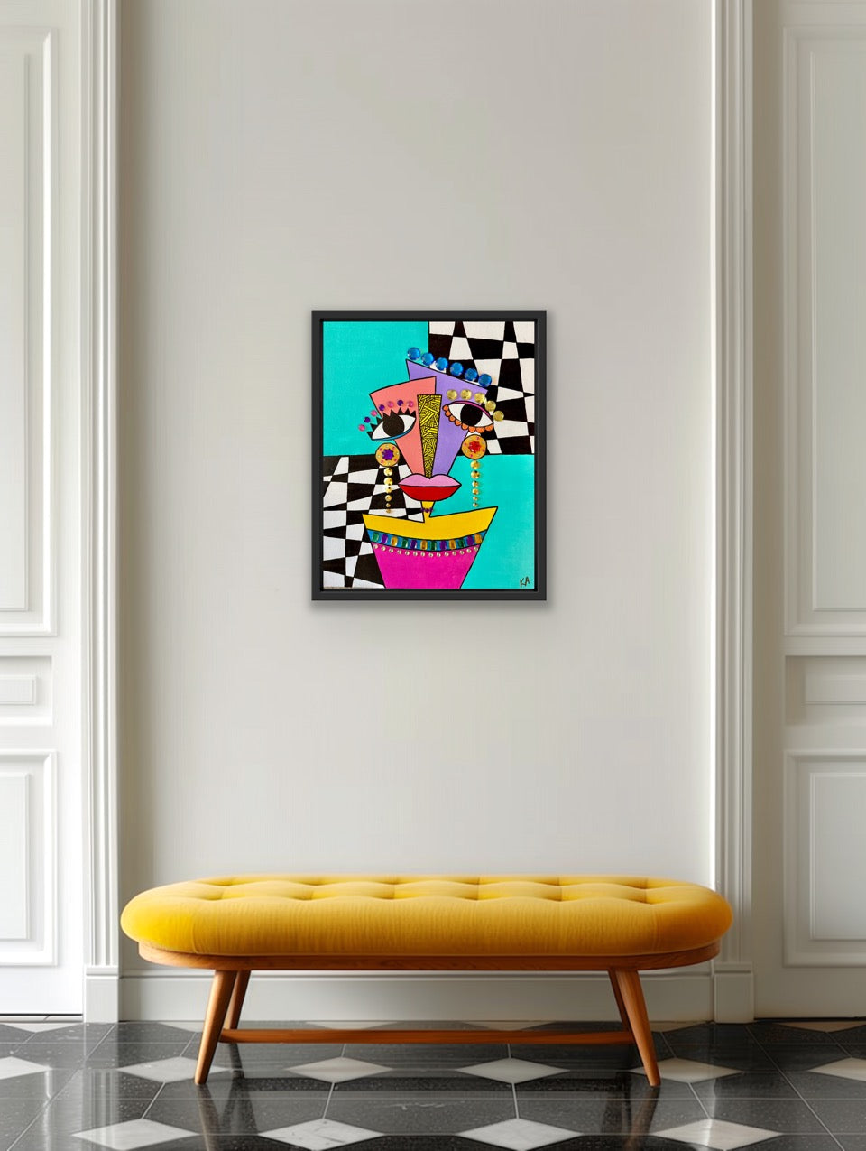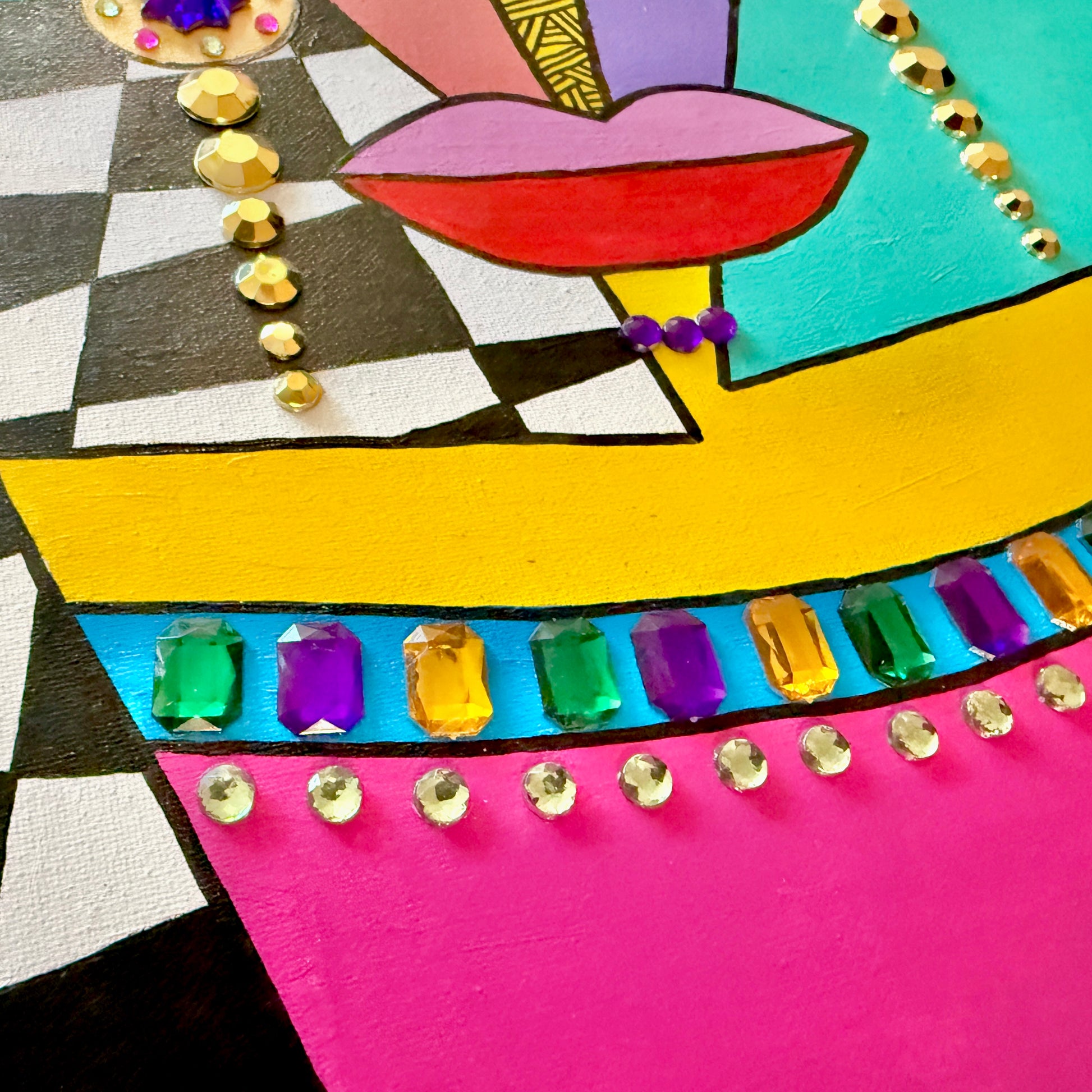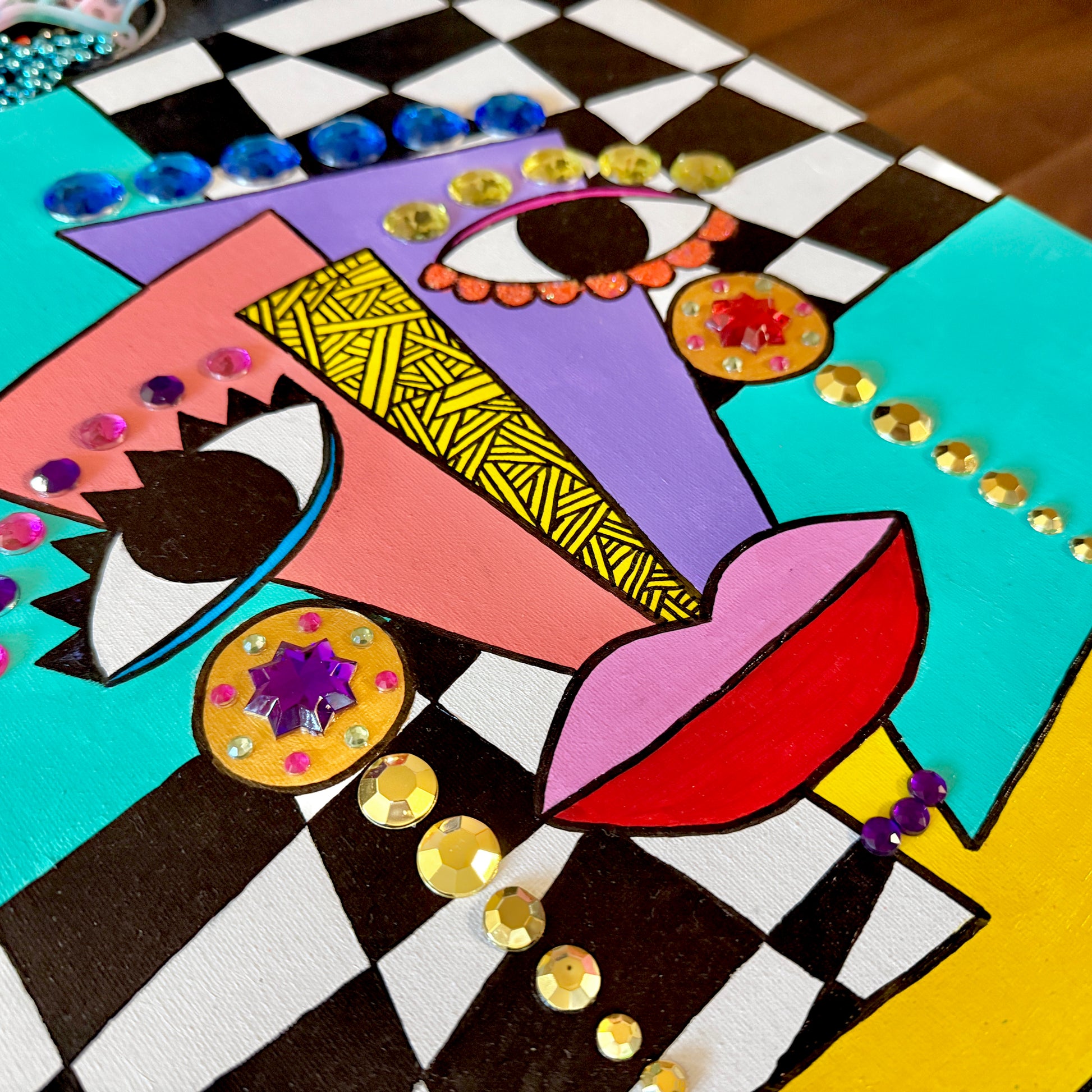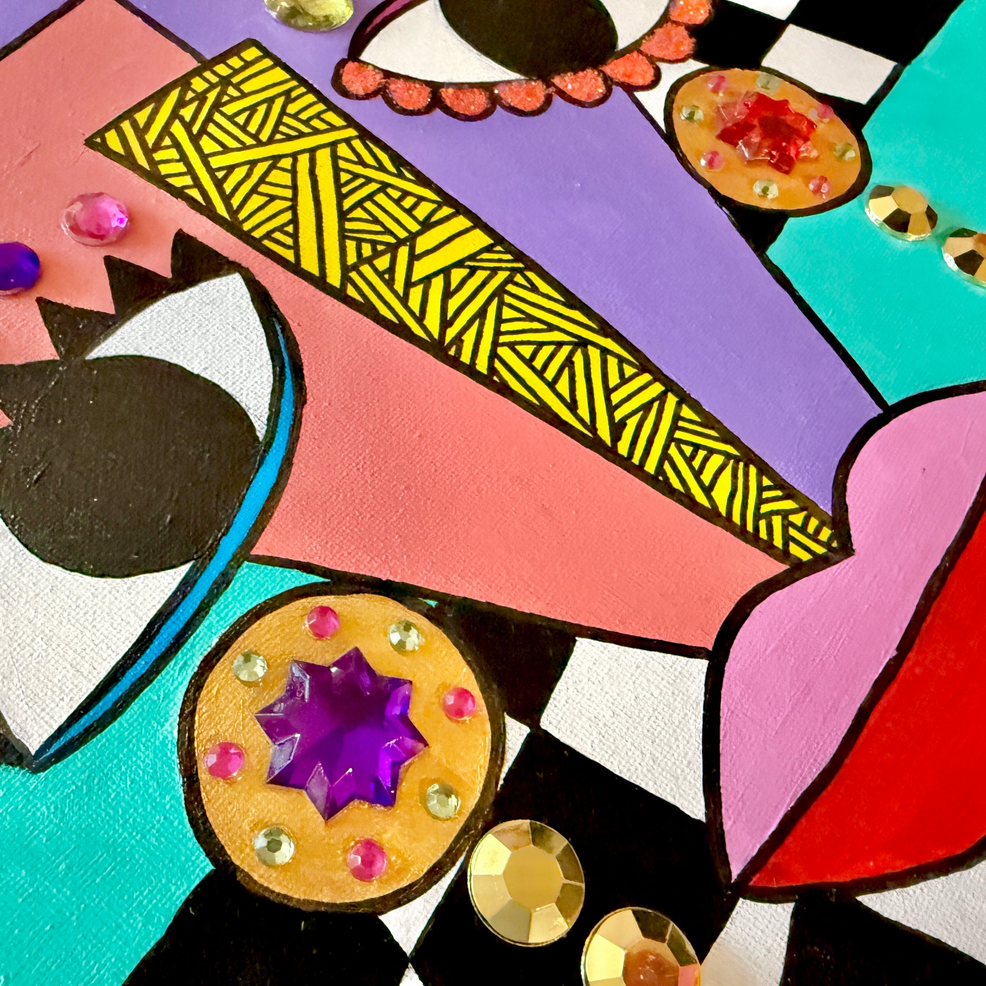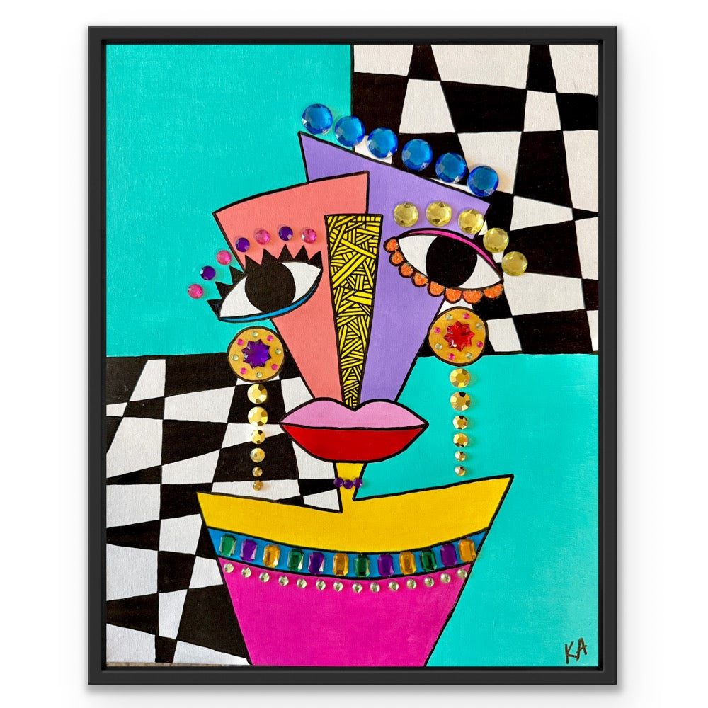 Mixed media painting, featuring acrylic paint, gems, and glitter on a 16x20 canvas in a black floating frame.