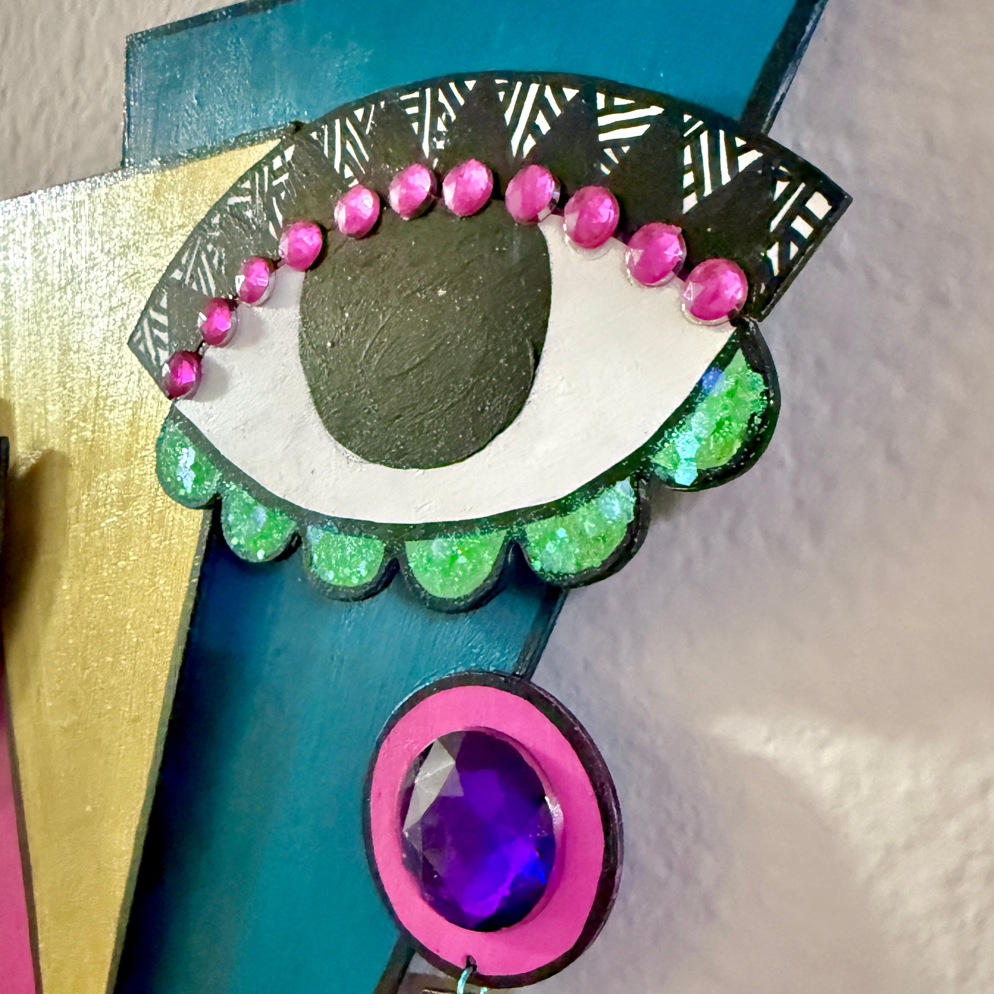 Mixed media 3D wall art, featuring wood, acrylic paint, gems, and glitter. Measures 10”x10.5”.