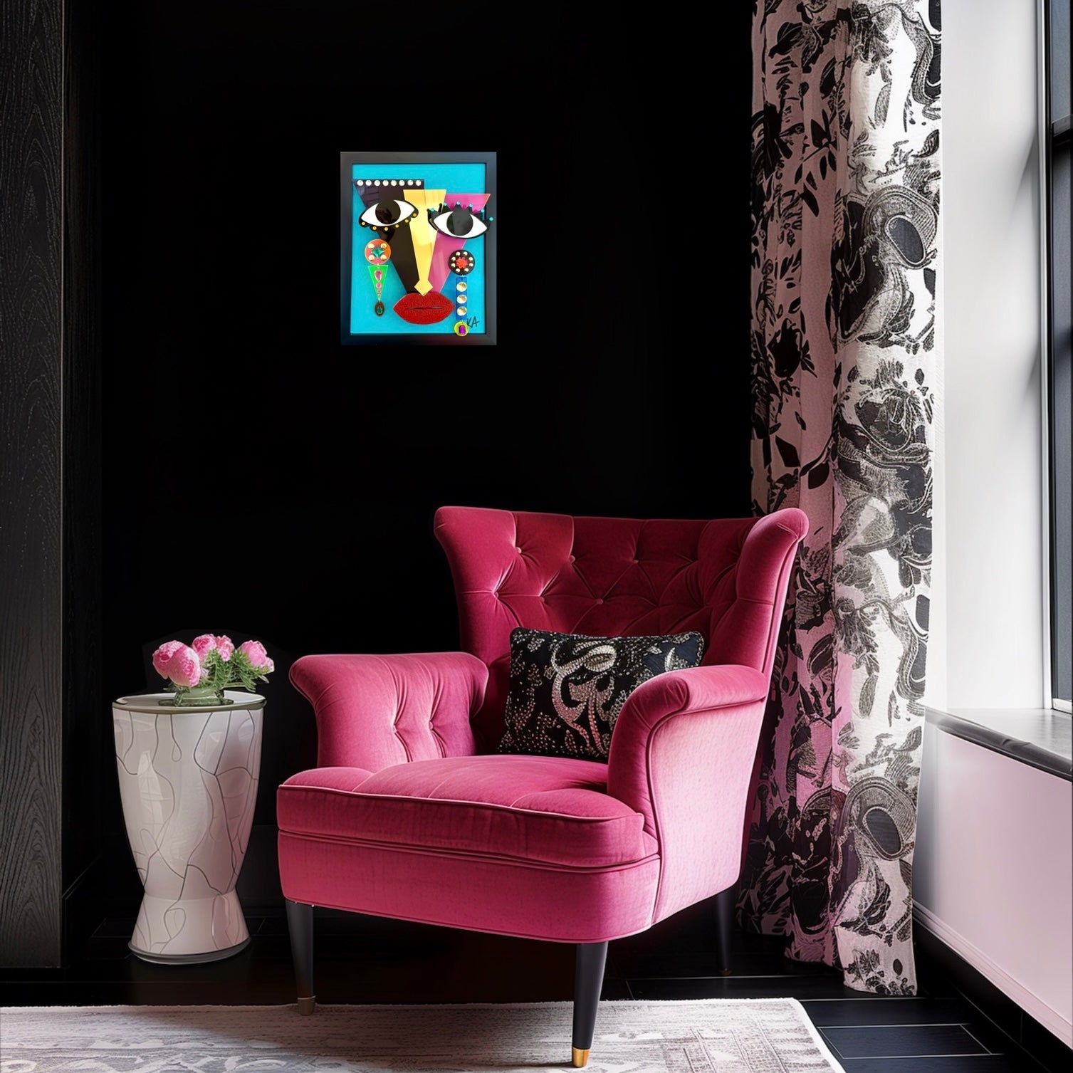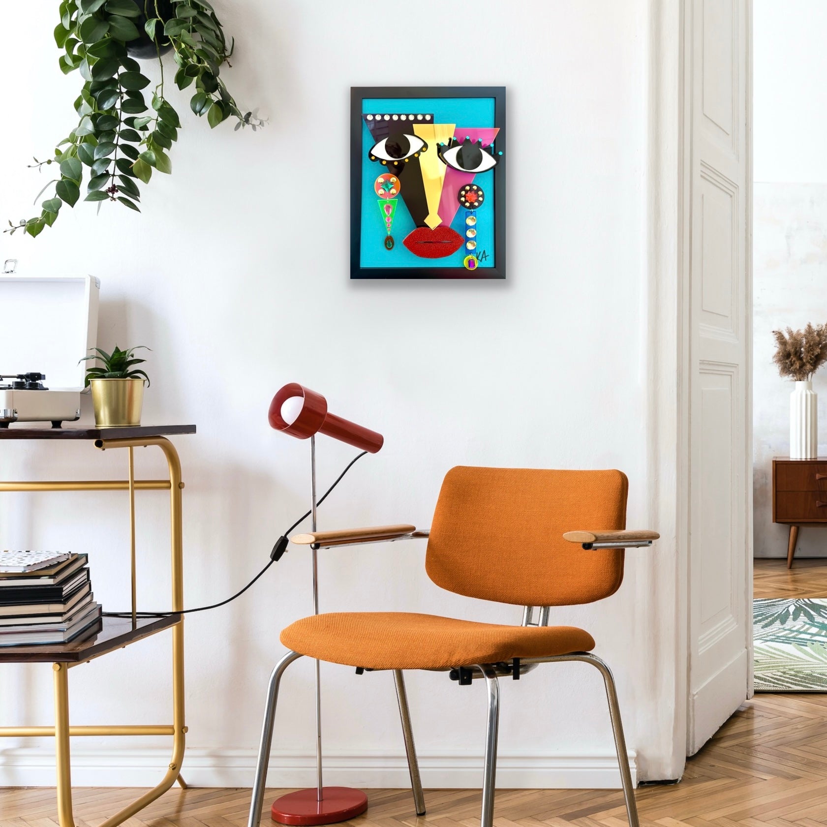 Mixed media 3D painting, featuring acrylic and gems, on a 11x14 canvas panel in a black frame.