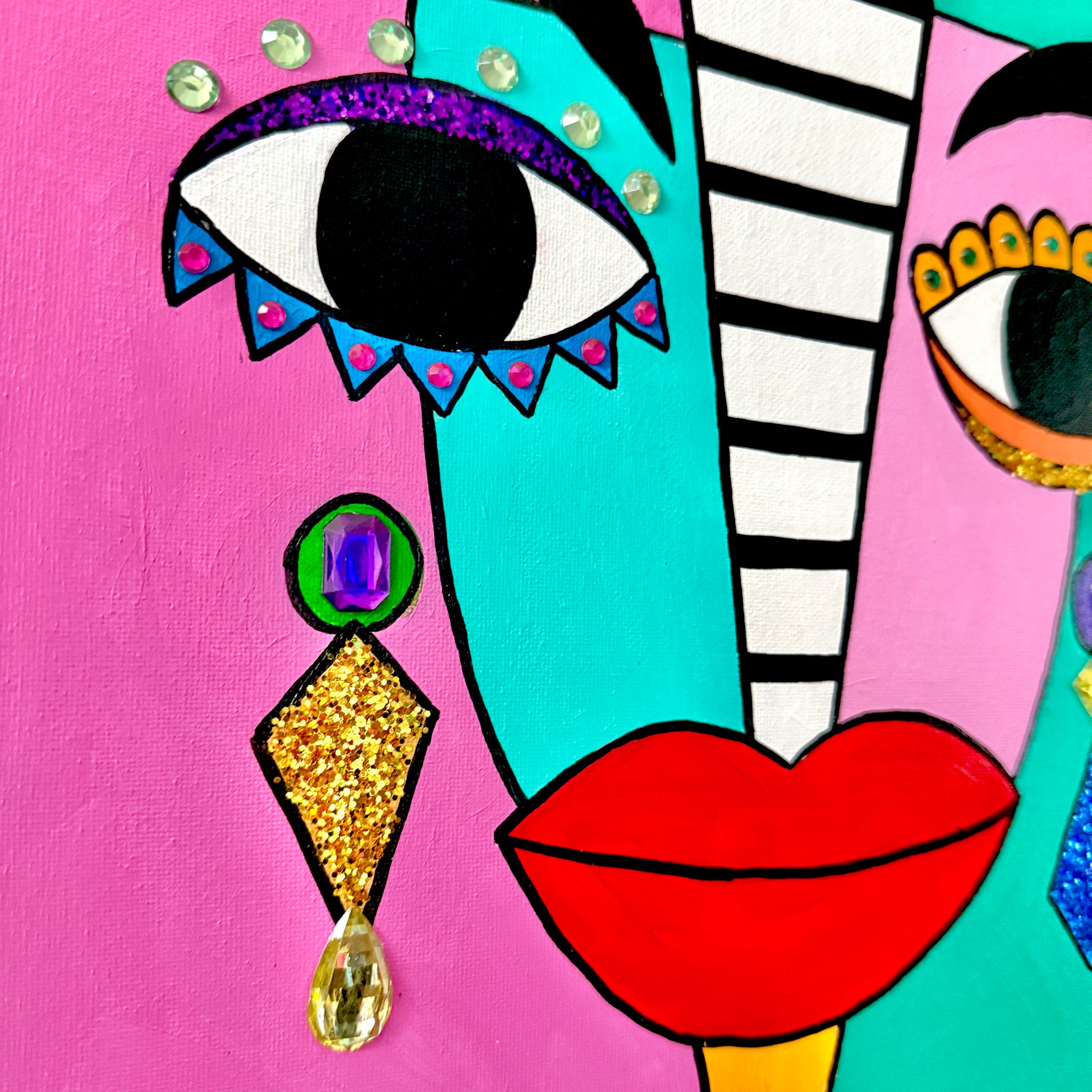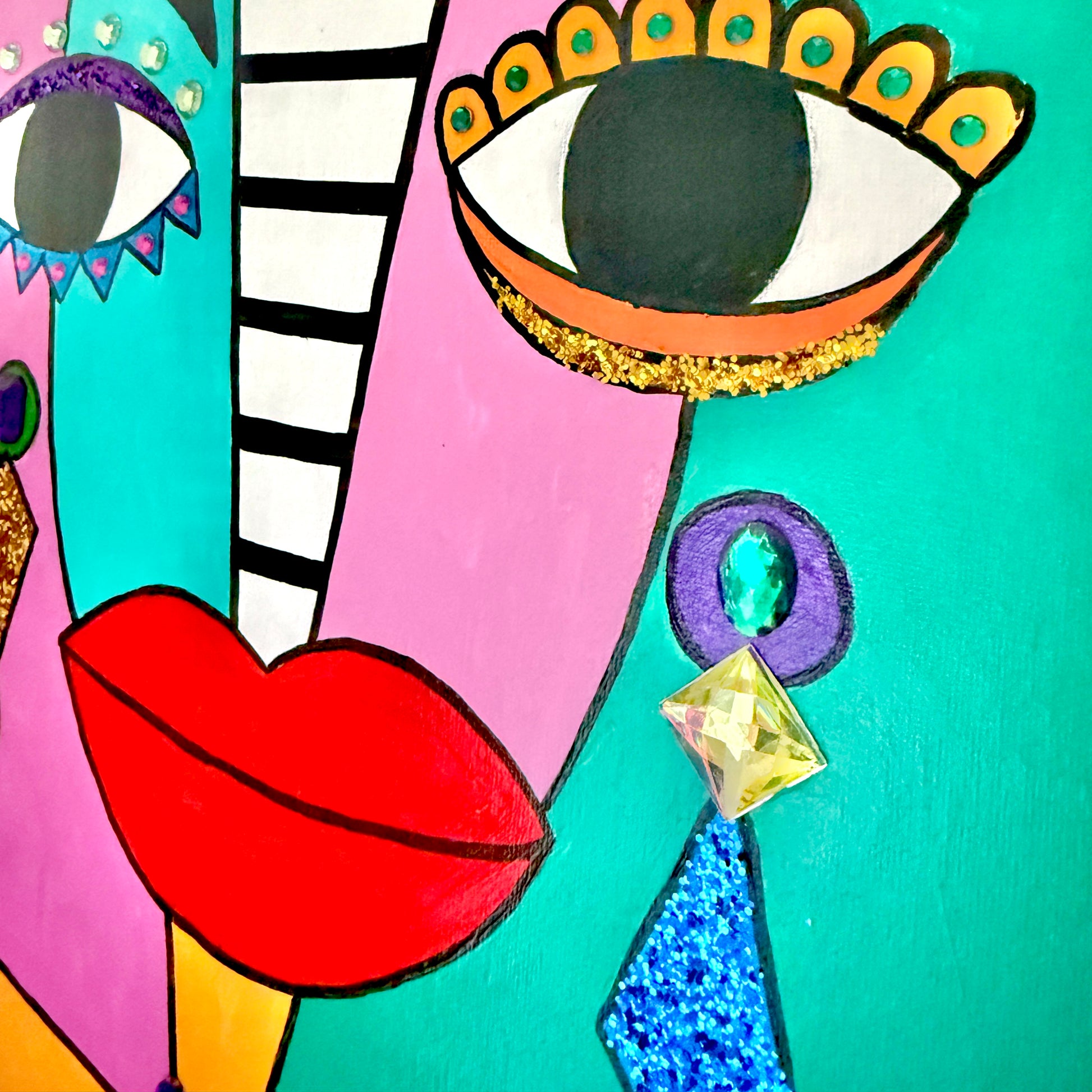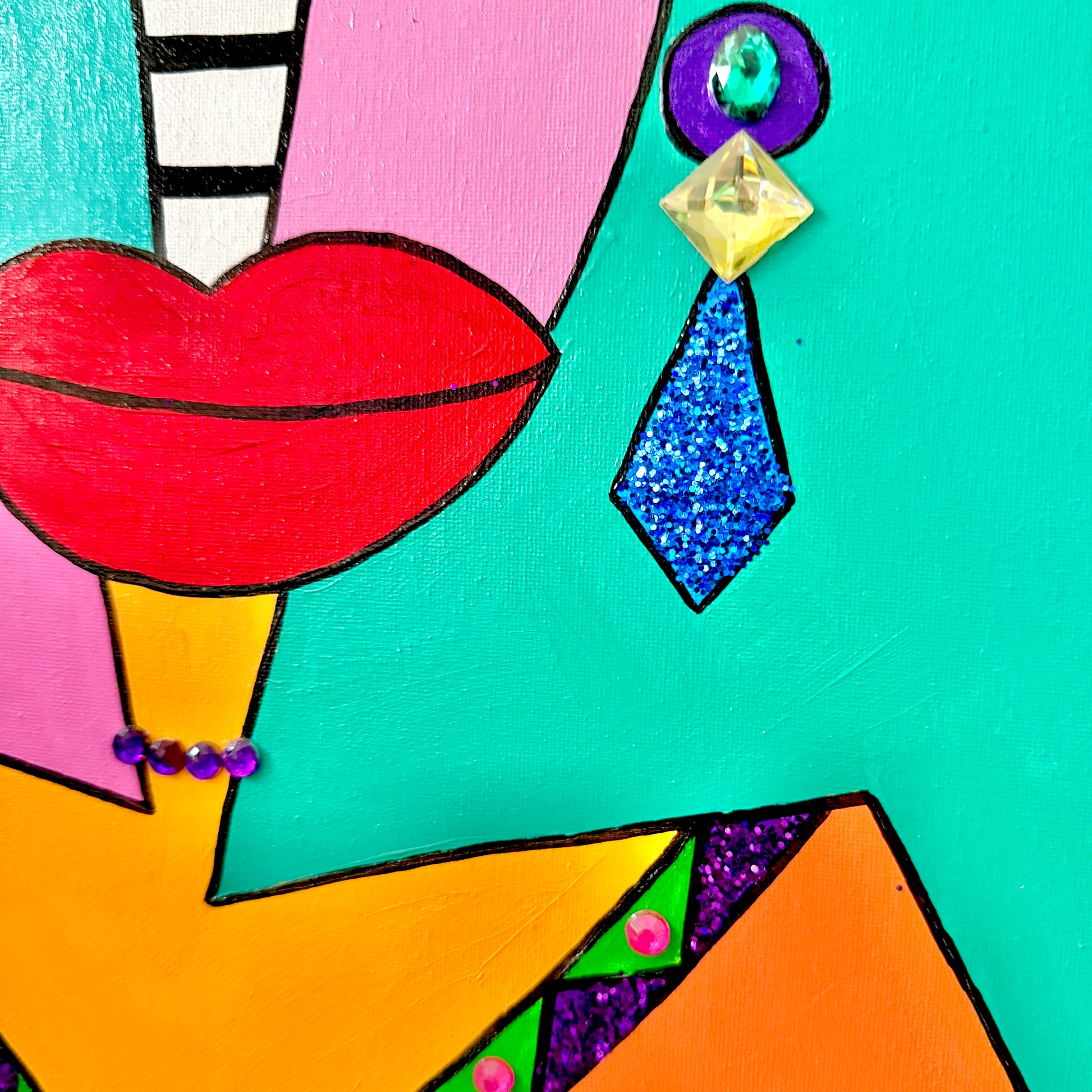 Mixed media painting, featuring acrylic paint, gems, and glitter on a 16x20 canvas in a black floating frame.