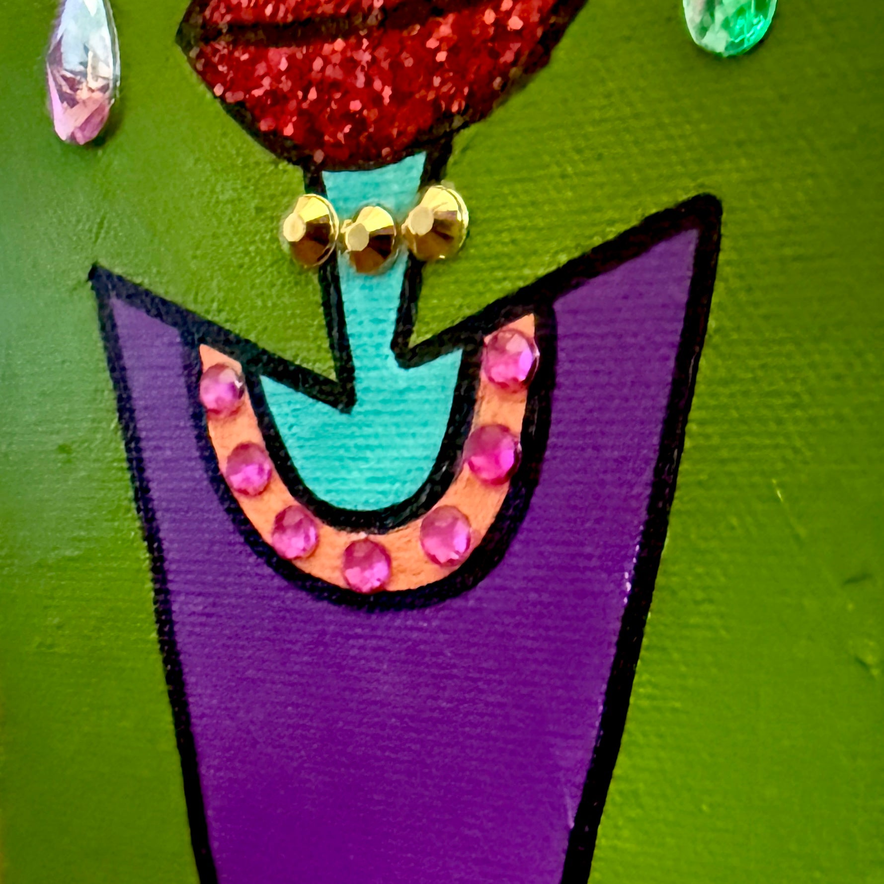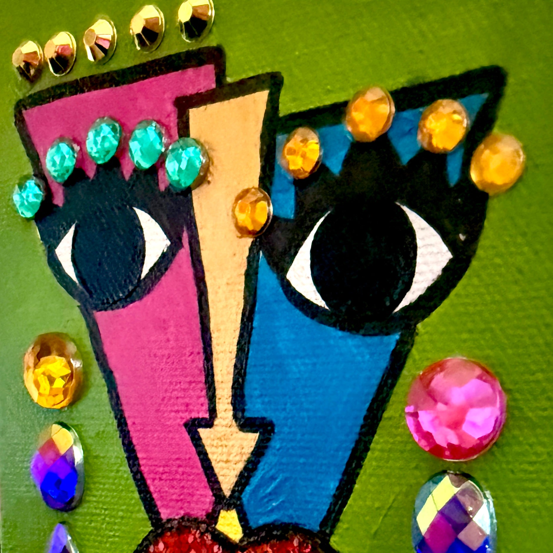 Mixed media painting, featuring acrylic paint, gems, and glitter on a 4x5 gallery-wrapped canvas.