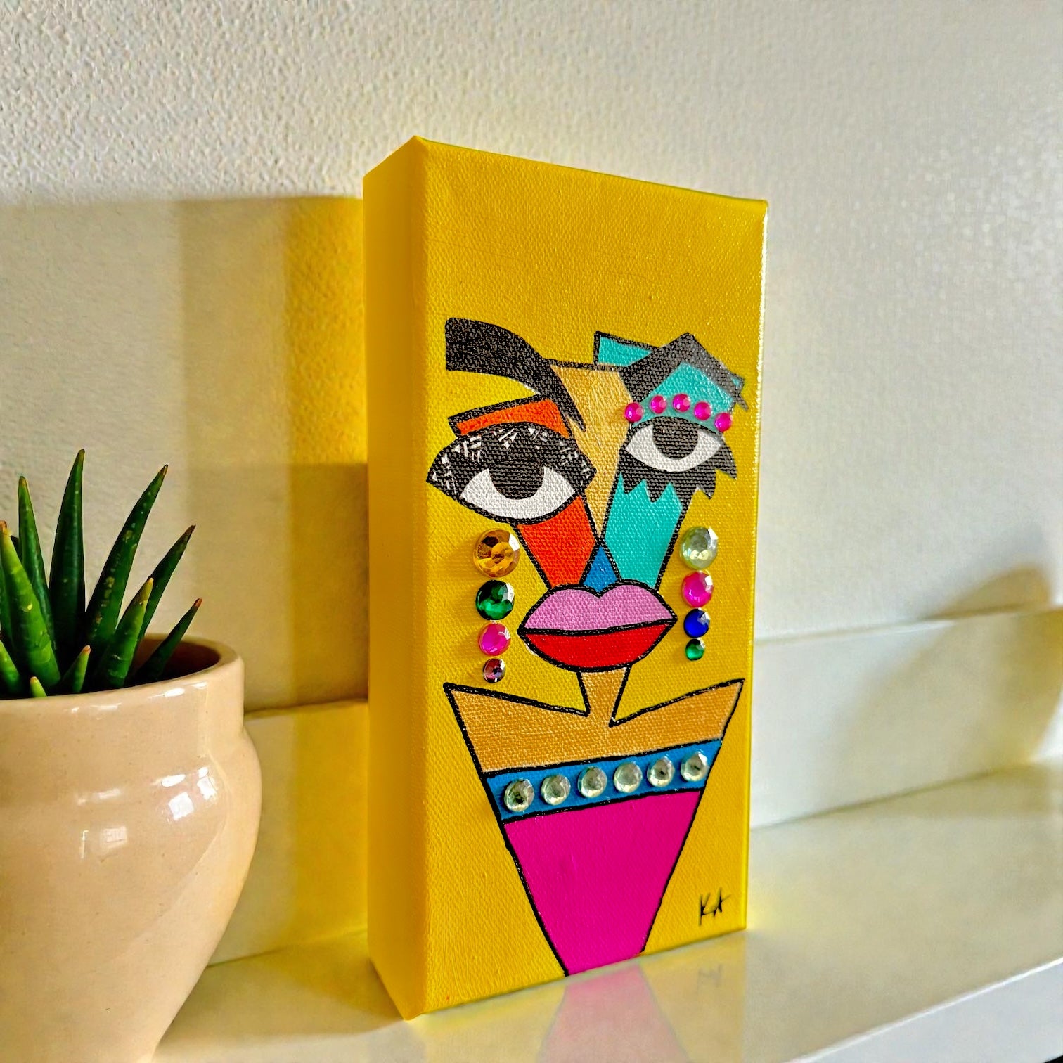 Mixed media painting, featuring acrylic paint, gems, and glitter on a 4x5 gallery-wrapped canvas.