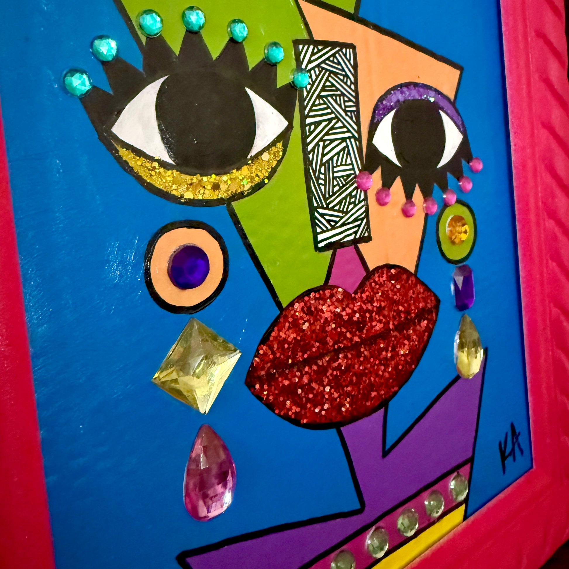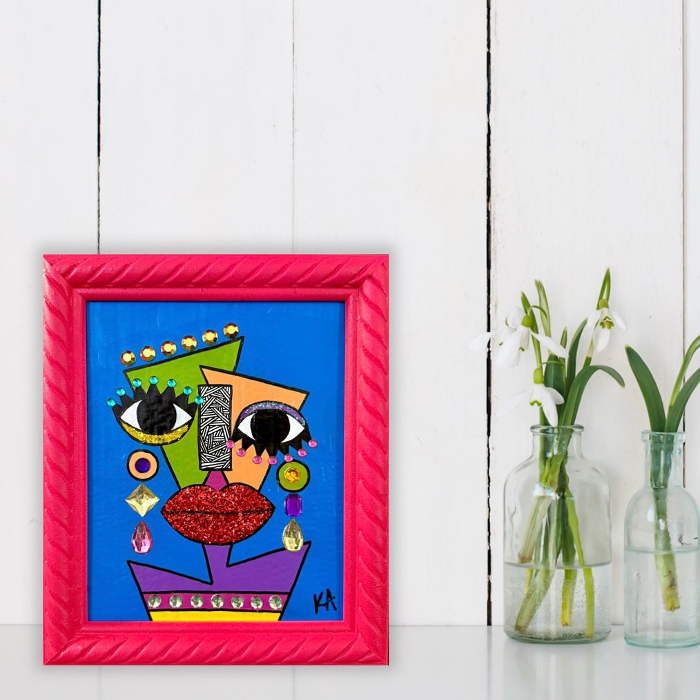 Mixed media painting, featuring acrylic paint, gems, and glitter on a 8x10 canvas in a pink standing frame.