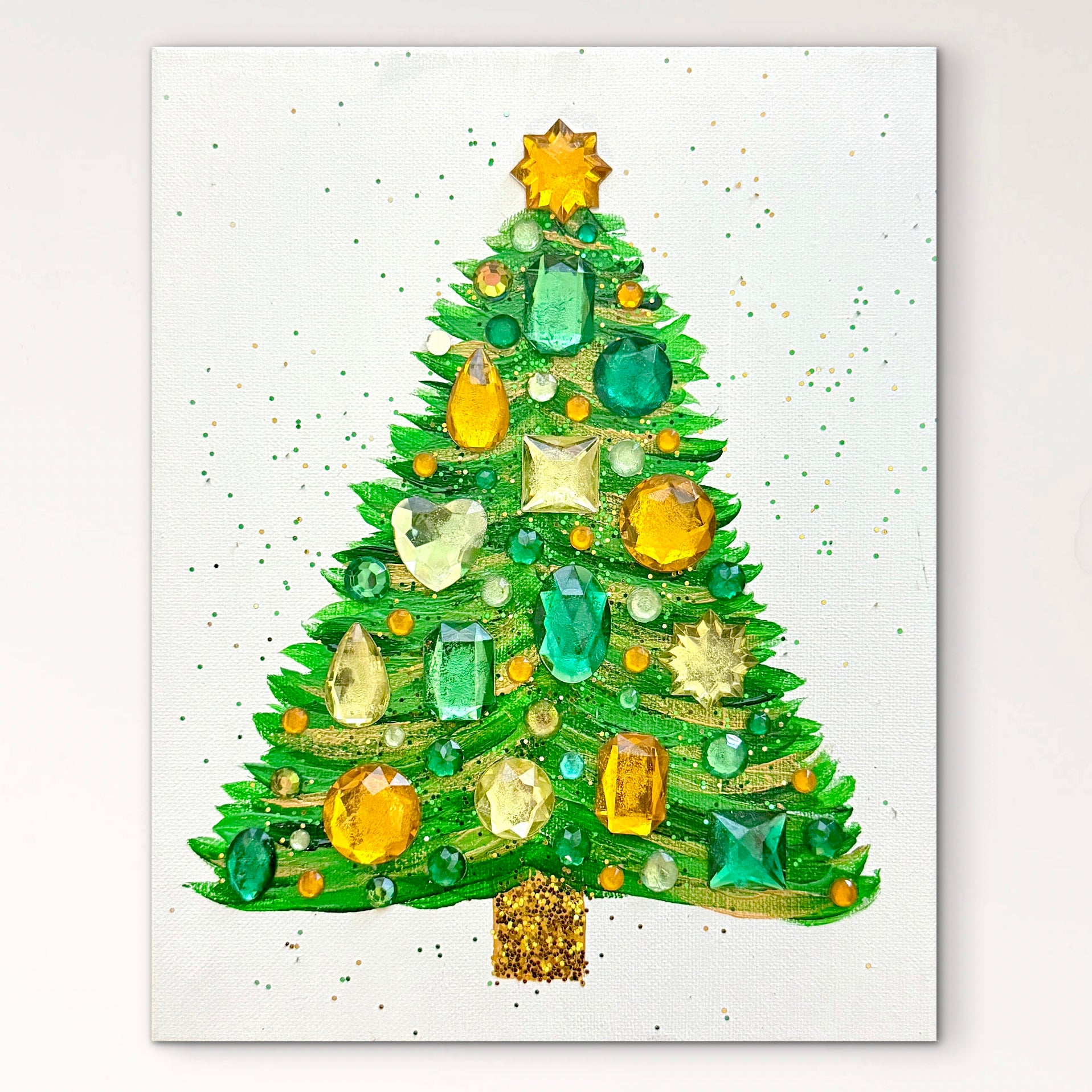 Handpainted with acrylic paint, glitter, and plastic gems on an 8x10 canvas. White wood frame optional.