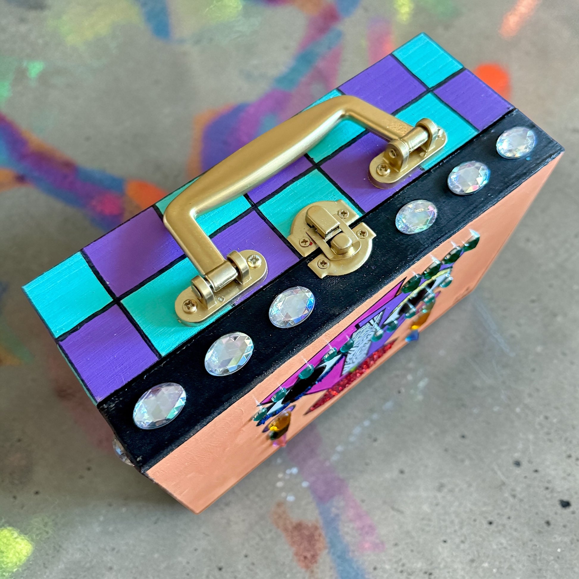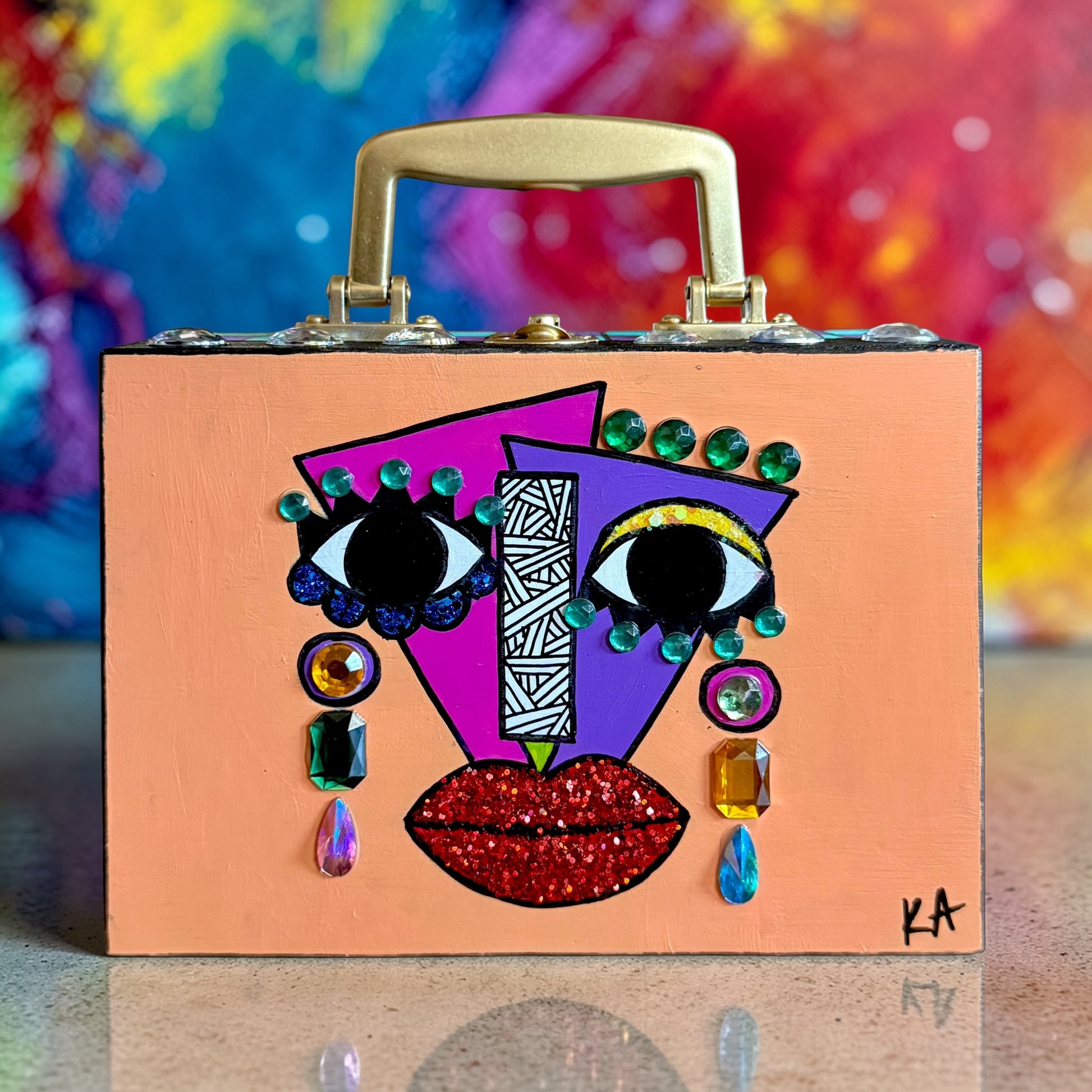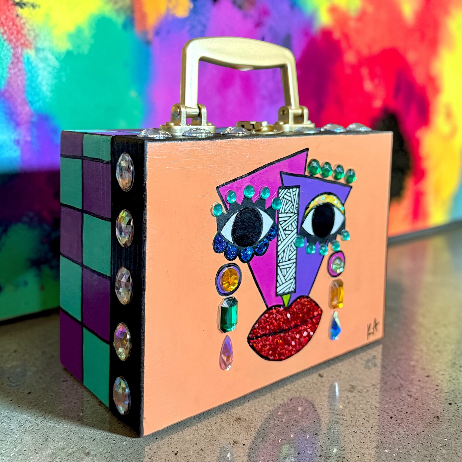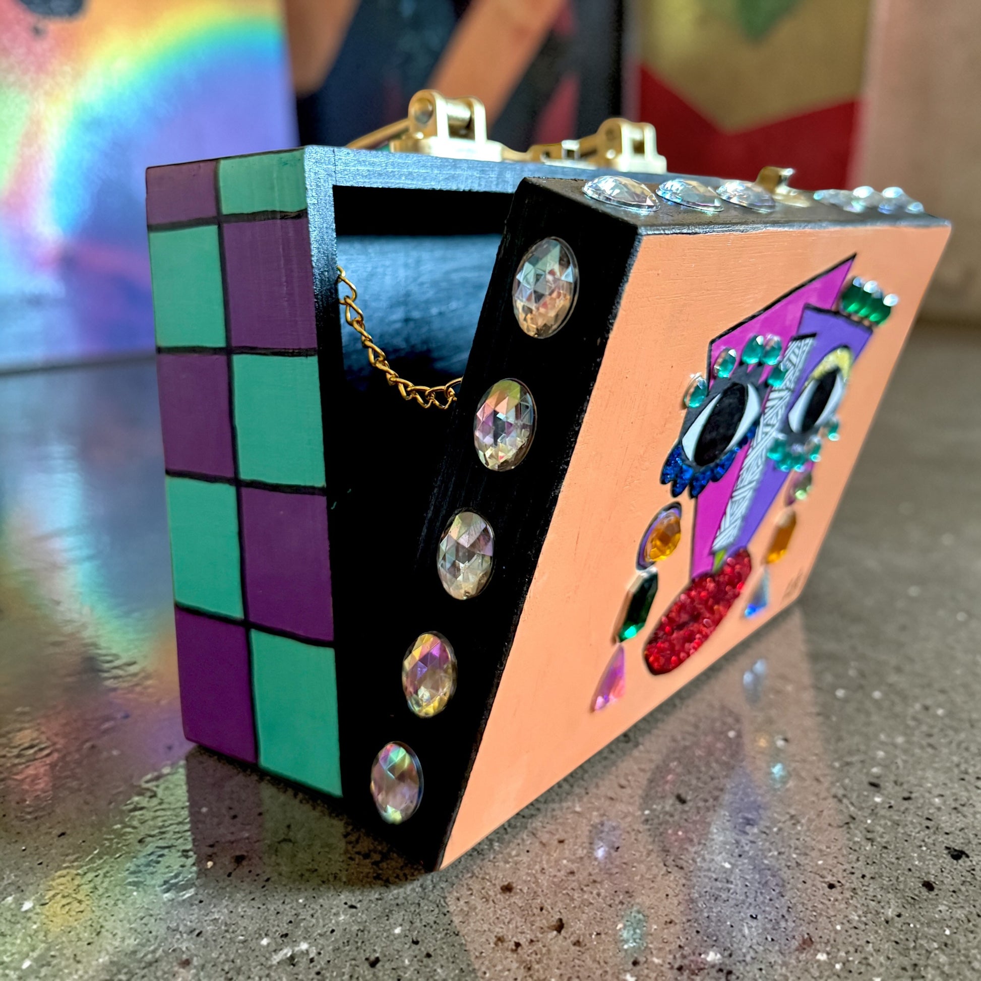 This stunning purse features an eye-catching handpainted Jeweled Cubist Pop Art™️, jeweled and checkered sides. Clasp closure. Measures 8”x5.5”x3”.