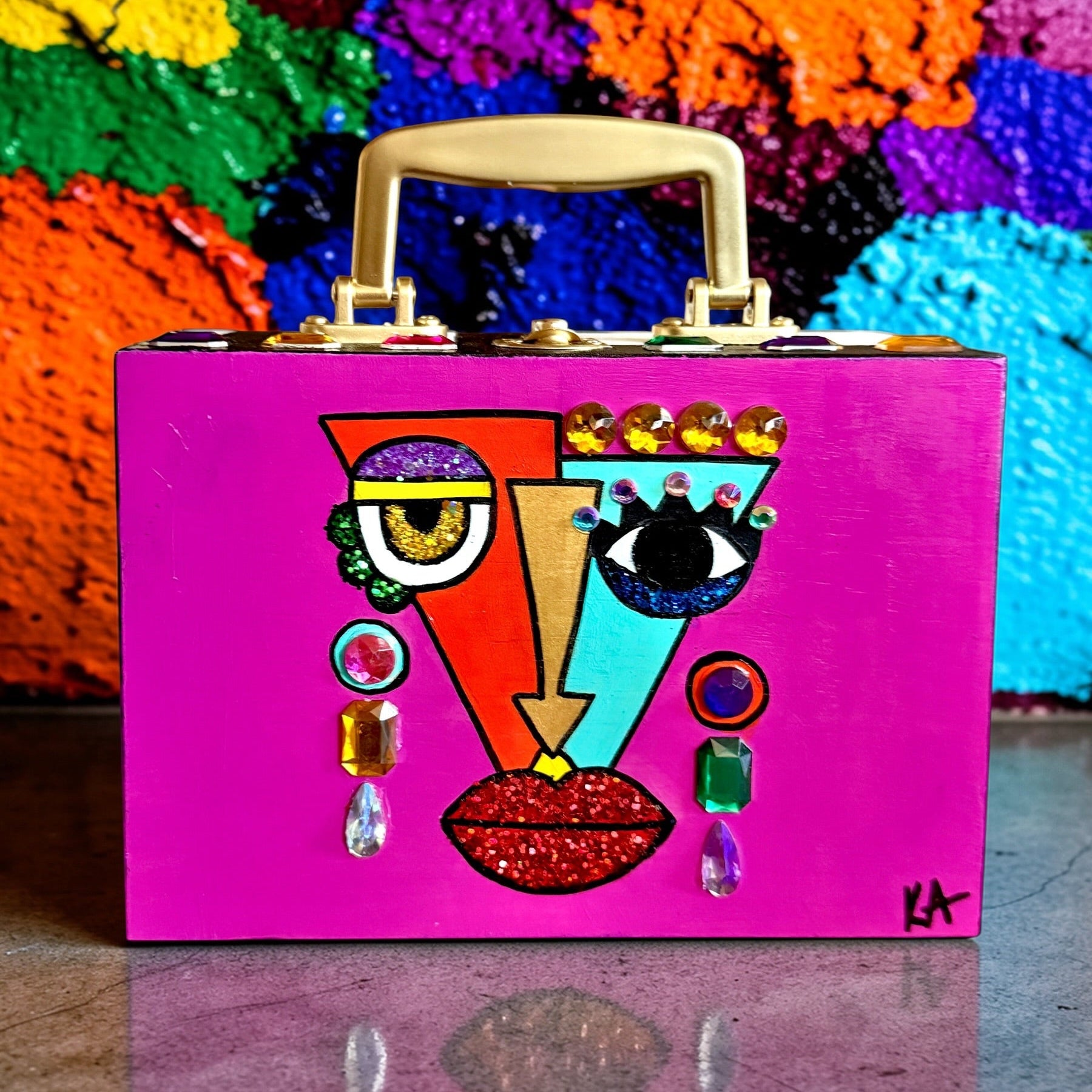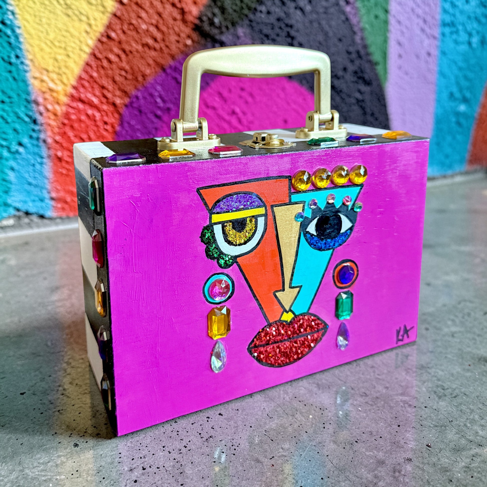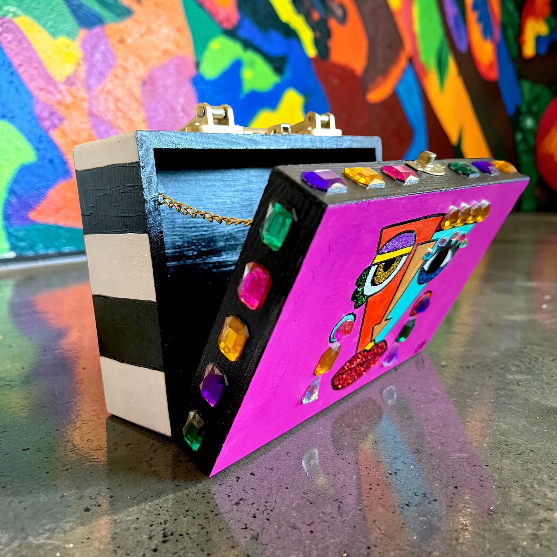 This stunning purse features an eye-catching handpainted Jeweled Cubist Pop Art™️, jeweled and checkered sides. Clasp closure. Measures 8”x5.5”x3”.