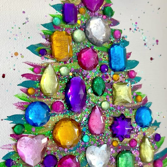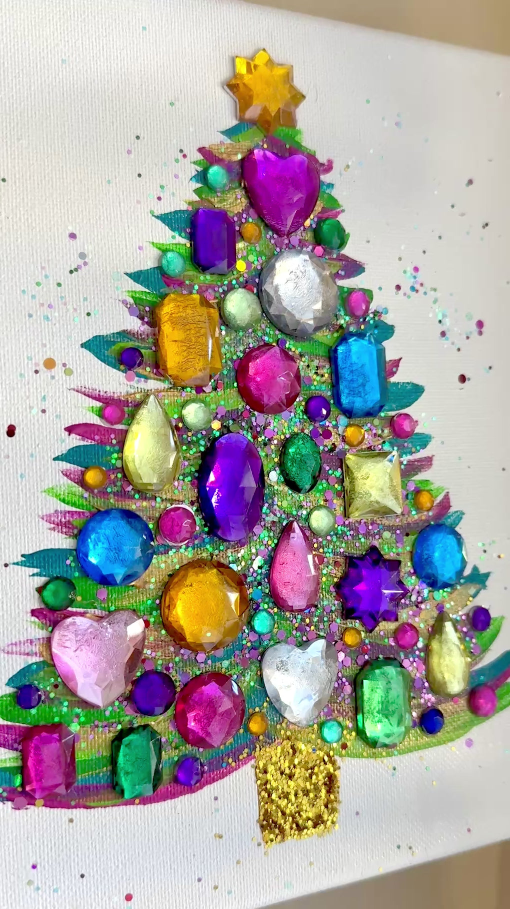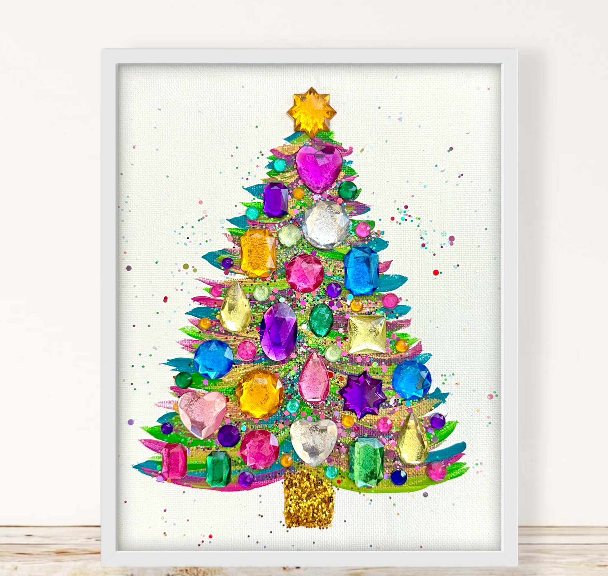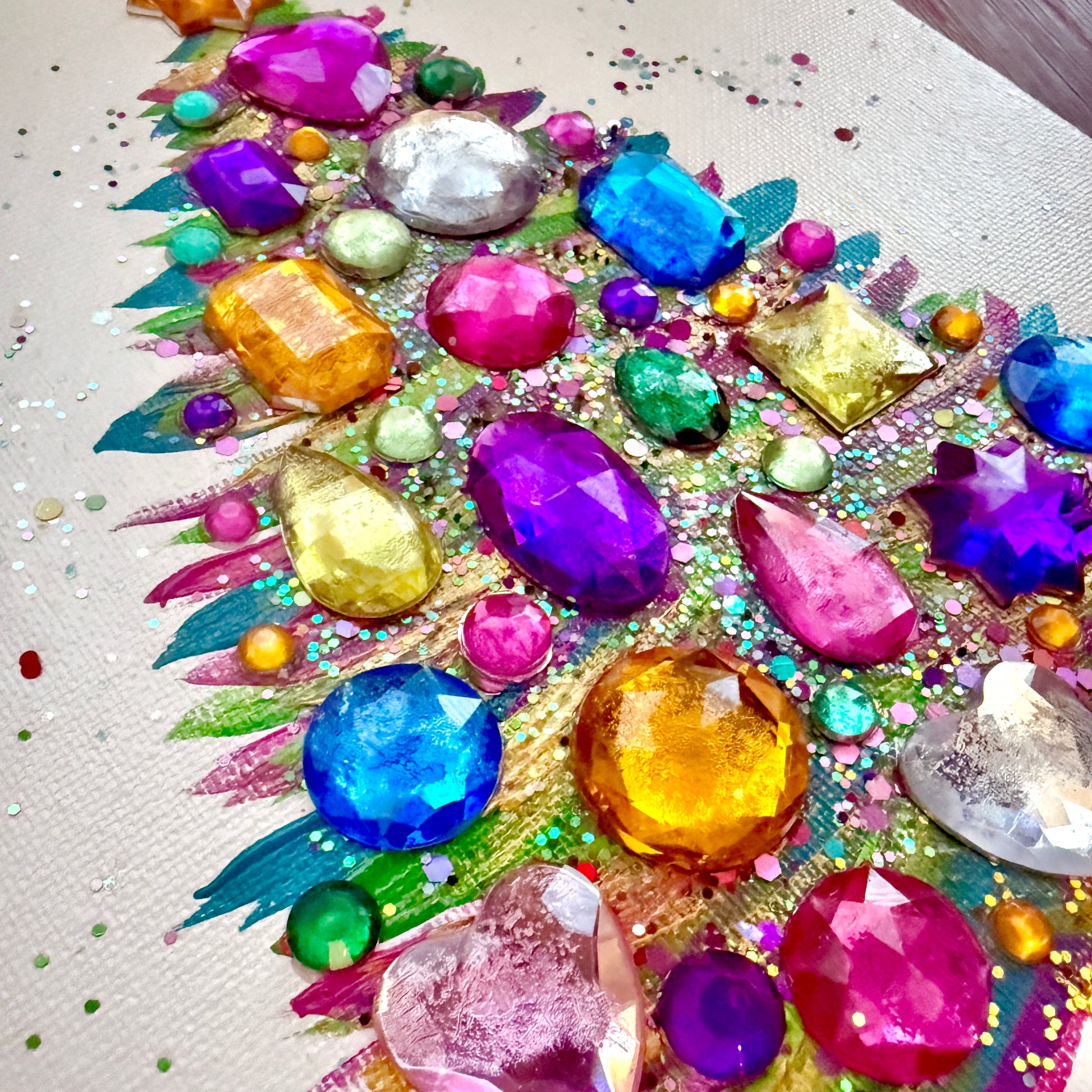 Handpainted with acrylic paint, glitter, and plastic gems on an 8x10 canvas. White wood frame optional.